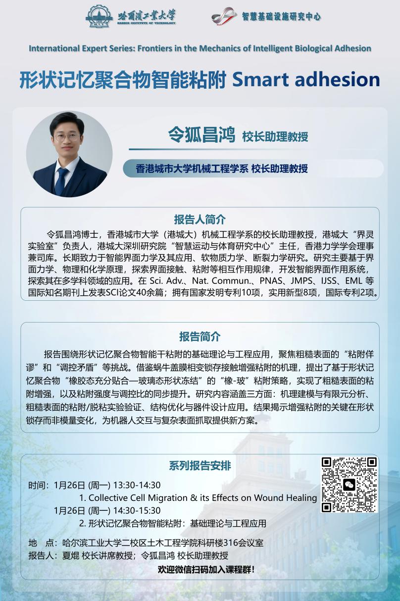 应土木工程学院邀请,香港城市大学机械工程学系令狐昌鸿校长助理教授于2026年01月25日到01月27日在我校访问,并就《生物智能粘附力学》作系列讲座,欢迎感兴趣的师生参加。